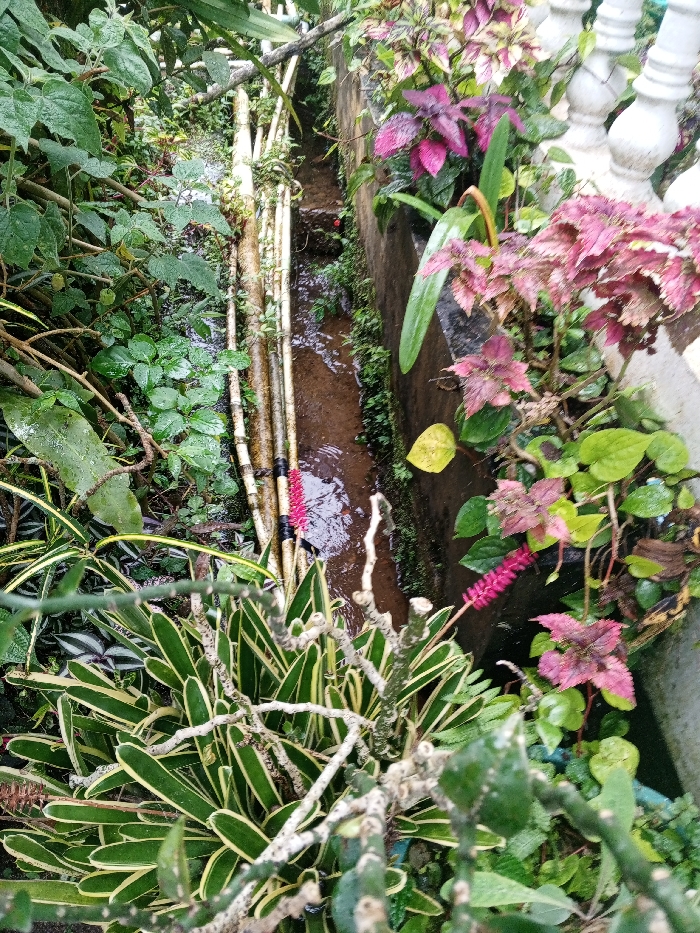 This image depicts a narrow, water-filled drainage channel in Khe Sanh Commune, Vietnam, bordered by dense tropical vegetation and a section of a white balustrade. The central feature is a shallow, brown-earthen or concrete-lined channel, approximately one foot in width, running diagonally from the upper left to the lower center. Brown-tinged water is visible flowing or pooled within it. Along the channel's left bank, at least five light-brown, bamboo-like poles or pipes run parallel to the water, partially submerged and intertwined with dark green foliage. Two of these poles are wrapped with black tape, and one prominently features a bright pink, bristly, cylindrical object secured to it. The right side of the channel is delineated by a concrete wall, above which a white, classical-style balustrade with several molded balusters is partially visible. Below the balustrade, vibrant foliage includes variegated coleus plants displaying prominent pink, purple, and green leaves. Another red, bristly, cylindrical object, similar to the one on the poles, is positioned among this vegetation. The foreground is characterized by lush plant growth, including a plant with long, sword-shaped leaves featuring green centers and yellow margins, and a gnarled, multi-branched, light-grey stem structure extending across the bottom of the frame. The entire scene is wet and verdant, suggesting a humid, tropical environment, under natural, diffused lighting. No individuals or animals are present.
