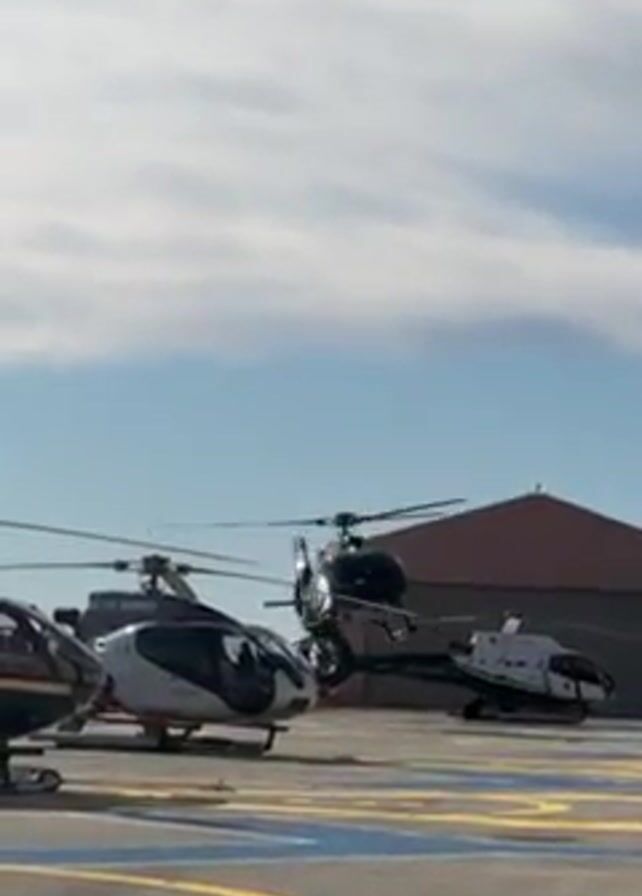 collection of helicopters parked on a helipad under a partly cloudy sky. There are four helicopters visible, each with a distinct color scheme and design. The helipad is marked with yellow lines and circles on a blue surface. In the background, a building with a reddish-brown roof can be seen. The sound of a helicopter flying nearby can be heard in the background.
