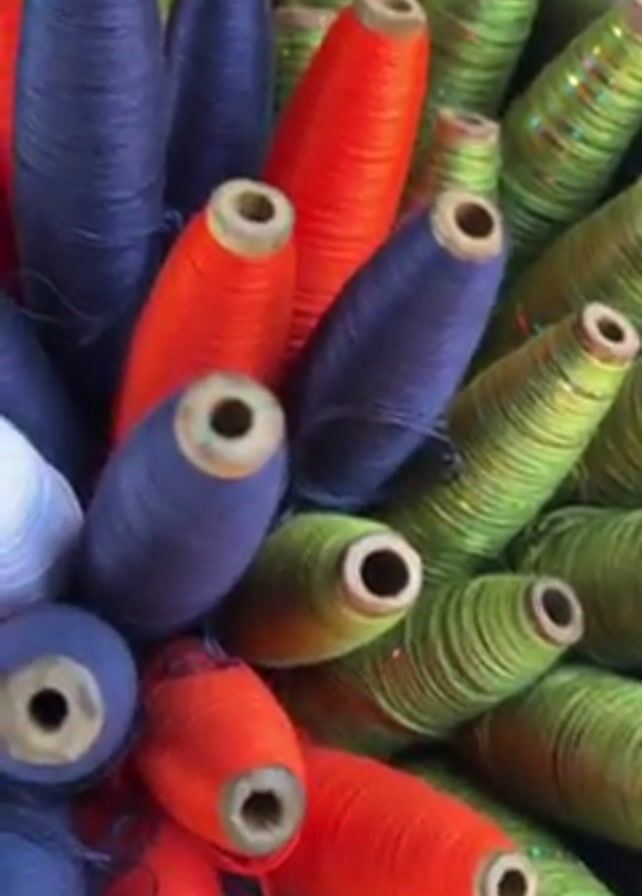 collection of spools of thread in various colors. The colors include red, blue, green, white, and teal. The spools are arranged close together in a container. The camera is positioned above the spools, providing a top-down view. The focus is sharp, highlighting the textures and colors of the thread. A voice can be heard in the background.