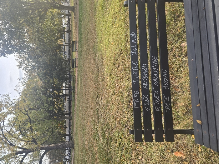 This image depicts a public park scene, likely within the National Mall area of Washington, D.C., United States. The foreground is dominated by a dark-colored, slatted park bench, its back inscribed with white graffiti. The inscriptions, from top to bottom on successive slats, read: "FREE TURTLE ISLAND," "FREE ARTSAKH," "FREE PALESTINE," and "FREE SUDAN." The ground around the bench is covered in a mix of green and dry brown grass, with scattered fallen leaves, suggesting an autumn season. In the midground, multiple identical dark-colored park benches are visible across an expansive grassy area. Mature trees with varying foliage density, some exhibiting yellowish-green leaves, populate the midground and background. Through the trees in the far background, a long, light-colored building or structure with multiple horizontal elements is partially discernible. No individuals are present, and no actions or interactions are depicted. The scene is illuminated by natural daylight.