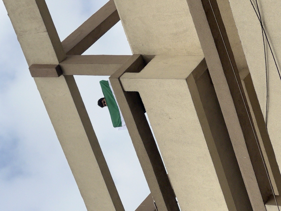Al-Qanawat Municipality, Syria. A male individual is positioned on an elevated concrete structure of a building, with only his upper face (eyes and forehead) visible above a horizontally striped flag. The flag displays a green stripe over a white stripe. The individual has dark hair, and sunglasses are perched on his head. The building's architecture consists of exposed light-colored concrete beams and columns. The sky above is overcast. Several dark electrical wires are present in the lower portion of the image.