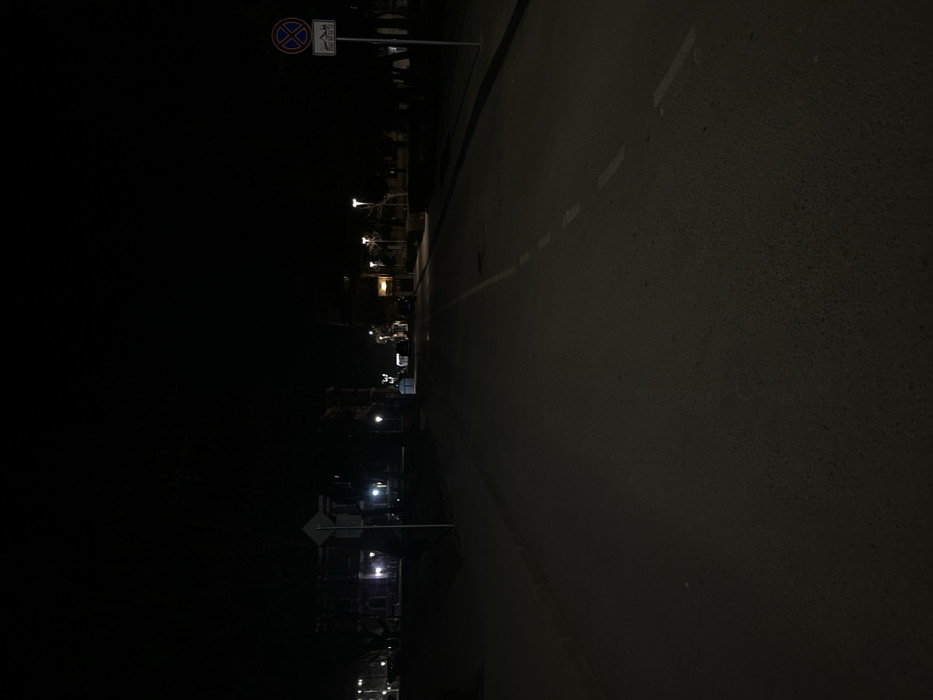 The image presents a static, nighttime street scene within the city of Kyustendil, Bulgaria. An asphalt road, featuring a dashed white lane marker that gradually curves towards the right, extends from the foreground into the mid-distance. No individuals are visible in the frame. On the left side of the road, a dark, square-shaped sign mounted on a pole is partially observable. Further along the right side of the road, a circular "No Stopping" sign (blue with a red diagonal cross) is clearly visible on a pole, positioned above a smaller rectangular sign displaying unreadable Cyrillic text. Multiple streetlights with white illumination are distributed along both sides of the road in the mid-distance, casting limited light. In the background, structures identified as buildings are discernible on both the left and right, exhibiting some interior or exterior lighting. Trees or dense vegetation line the roadside, largely obscured by the pervasive darkness. The sky is uniformly black, indicating a complete absence of natural light sources such as the moon or stars. The overall environment is dark and calm, with no active movement or interactions depicted.