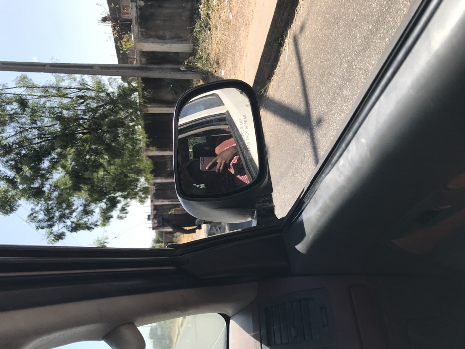 The image depicts an outdoor street scene in Jimeta, Nigeria, captured from the interior of a vehicle during daylight hours under clear skies. The immediate foreground shows a dark gray dashboard section and the upper portion of a passenger-side door panel. A black exterior side mirror is prominently positioned, reflecting a partial view of a person seated inside the vehicle. This individual's upper torso and arm are visible, holding a dark-colored smartphone, with which they appear to be taking the photograph. Their face is obscured by shadow and the phone; they are wearing a top with a red or pink patterned design. The side mirror contains the printed text "OBJECTS IN MIRROR ARE CLOSER THAN THEY APPEAR". Outside the vehicle, an asphalt road surface is visible, extending towards the background. A concrete curb separates the road from a dirt shoulder on the right. A dark-skinned individual, dressed in dark clothing and a dark cap, is observed walking away from the vehicle on the far side of the road. Further beyond the road and shoulder, a series of textured concrete block walls are present, behind which a large tree with dense green foliage stands prominently. A gray utility pole is positioned upright near the concrete wall on the right. Strong, distinct shadows, including a diagonal shadow originating from the vehicle's mirror structure and a vertical shadow from the utility pole, are cast upon the asphalt, indicating bright sunlight.
