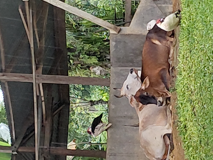 Two cows stand on a concrete surface next to green grass. One cow is brown, the other is primarily light brown. A black bird stands near the cows. A wooden structure with a roof stands adjacent, behind the cows. Green foliage is visible in the background behind the wooden structure.