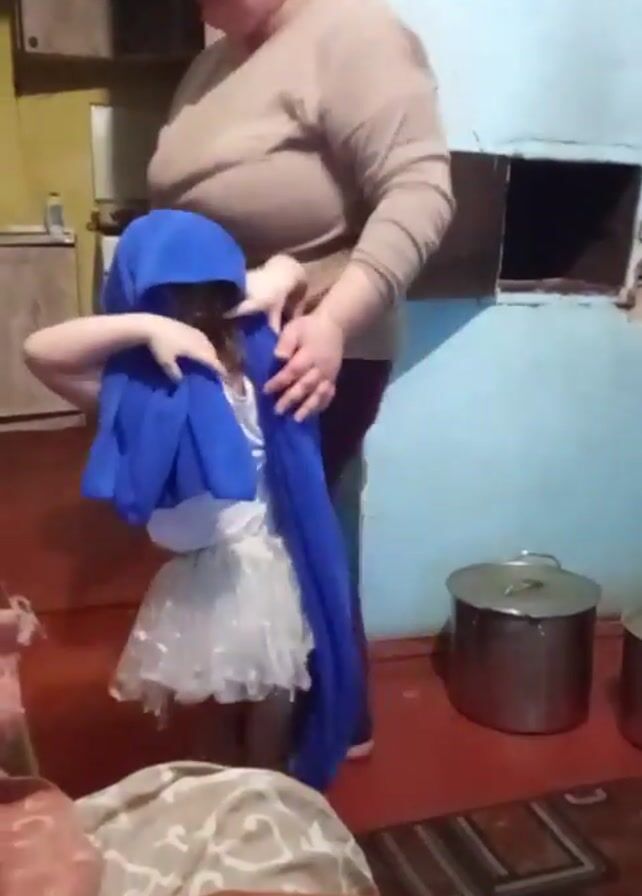 In a domestic setting, a woman and a young child are seen interacting. The woman, wearing a beige long-sleeved shirt and dark purple pants, is standing and appears to be handing the child a white cloth or towel. The child, who is holding a blue fabric or towel over their head, is wearing a white shirt and what appears to be a shimmery skirt. They are standing on a patterned rug with a couch visible in the foreground. There are two large pots on the floor next to an old-fashioned wood stove. The walls of the room are painted in different colors - yellow in the background and light blue closer to the camera. The woman gestures with her hands as she interacts with the child. The overall lighting in the room appears dim.