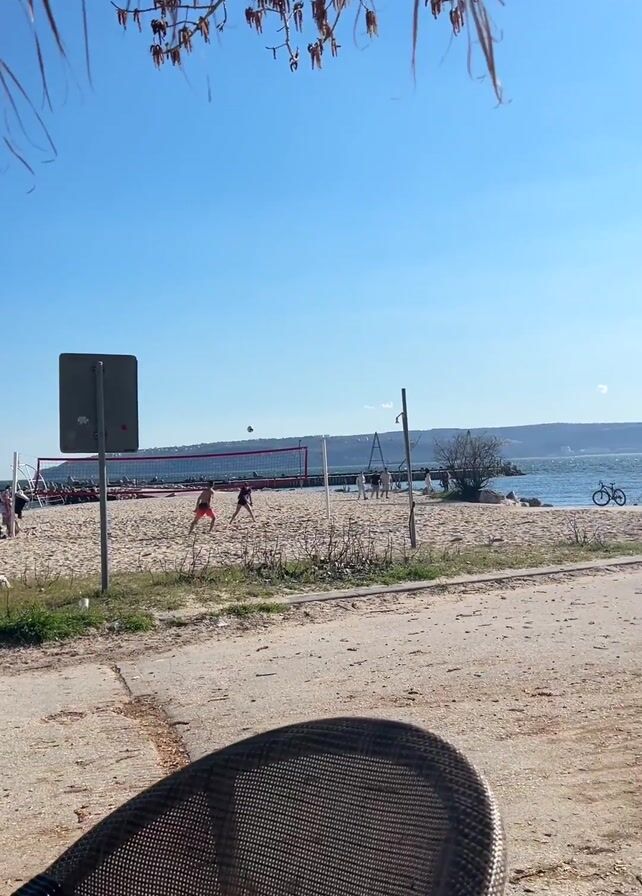 The camera is positioned under a straw umbrella at a beachside cafe. In the foreground, the black woven back of a chair is visible. Behind the chair is a sandy area leading to a beach, where people are engaged in various activities. Some are playing beach volleyball at a net, while others are walking or sitting near the water. The sky is clear and blue, and the sea stretches out to the horizon. A square road sign stands near the volleyball area. A black purse with a white handle rests near the chair.