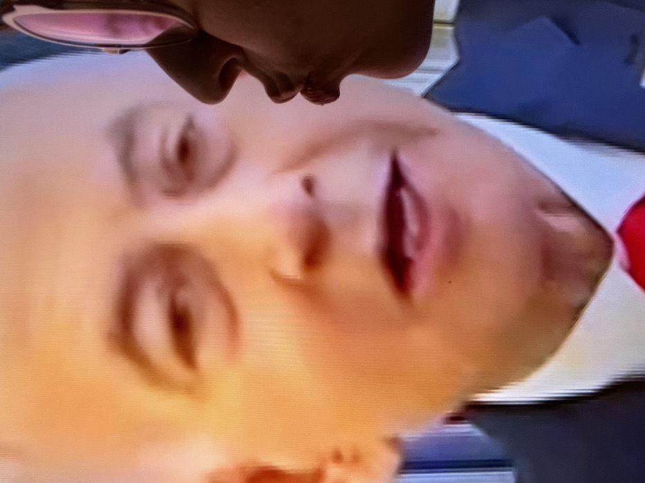 A close-up shot presents two individuals. The lower figure is a fair-skinned, bald man in a suit and tie, with his mouth slightly open. He appears to be in motion. The upper figure is a person with dark hair and skin, wearing pink-tinted glasses. Only the nose and lips are visible, positioned very close to the bald man's face, suggesting a kiss or close proximity. The overall perspective is skewed, tilting the image slightly to the left.