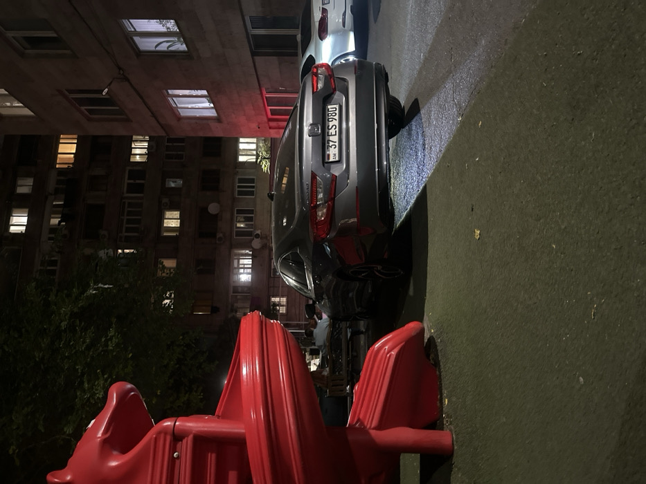 The image depicts a nighttime urban scene in a residential area of Yerevan, Armenia. In the immediate foreground, to the left, a large, bright red plastic playground slide, possibly part of an animal-themed structure, dominates the left frame. The ground beneath is a dark, textured safety surface. In the midground, a dark grey Honda Accord sedan, bearing Armenian license plate "37 ES 980," is parked with its rear facing the viewer. Its taillights are off. A distinct light source illuminates a strip of the asphalt ground directly behind the car. To the right of the Honda, the front portion of a white vehicle, likely a BMW, is partially visible. Behind the playground slide and partially obscured by the Honda, a wooden bench can be seen, with at least two individuals seated on it, their actions indistinct due to low light and obstruction. Dark-foliaged trees are present behind the playground and cars. The background consists of multiple multi-story residential buildings. The taller building on the left features numerous illuminated windows and several satellite dishes, indicating an apartment complex. A second, slightly shorter building on the right also has illuminated windows and a visible wall-mounted light fixture. Overall, the scene is dimly lit by ambient city lights and interior lights emanating from the building windows, characteristic of a residential courtyard or street after dusk.