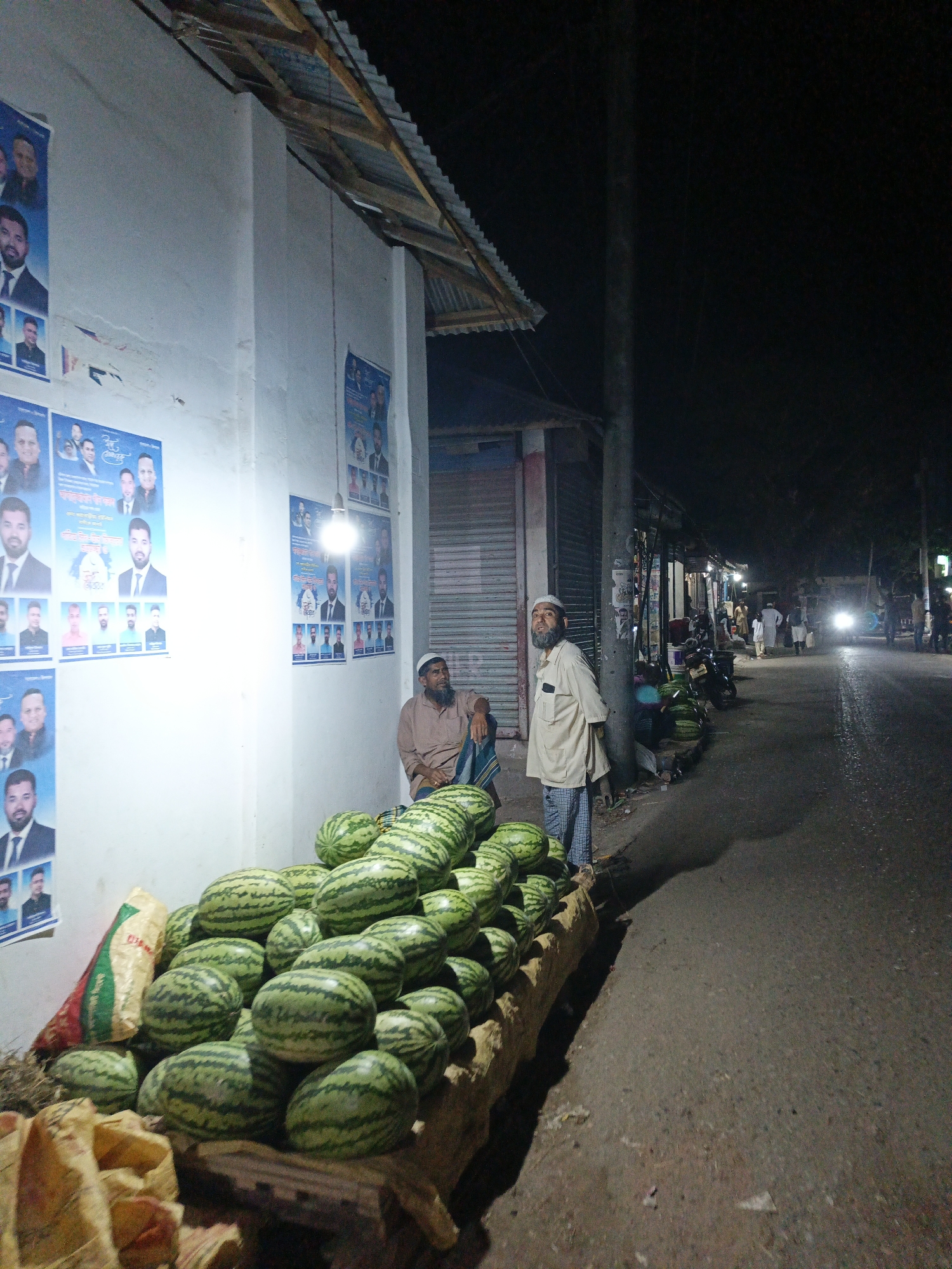 At night in Kauria, Bangladesh, two men stand beside a large pile of watermelons for sale. The watermelons are stacked on a wooden platform covered with burlap sacks. The men both wear traditional Muslim clothing, including white hats. One man is seated while the other stands. A white building with political posters is in the background. A streetlight illuminates the scene. A row of shops and pedestrians line the street, and a car's headlights are visible in the distance.