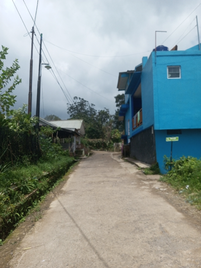 The image displays an upward-sloping concrete path in Ura-Dozhi, Bhutan, under an overcast sky. On the left side, a concrete drainage ditch parallels the path, bordered by dense green vegetation and overgrown plants. Further left, two dark utility poles support multiple overhead power lines and a single street light. Beyond these poles, a single-story structure with a light-colored, possibly corrugated metal, roof and wooden support beams is partially visible. On the right, a multi-story building, painted bright turquoise blue, features a dark grey lower foundation. This building includes a small, white-framed window on its upper section and a balcony on a lower level where several articles of clothing are hanging to dry. A green rectangular sign with white text is affixed to the blue wall near ground level. The roof of the blue building supports a blue cylindrical water tank within a metal framework. The background consists of dense green trees and foliage. No individuals are present in the scene.