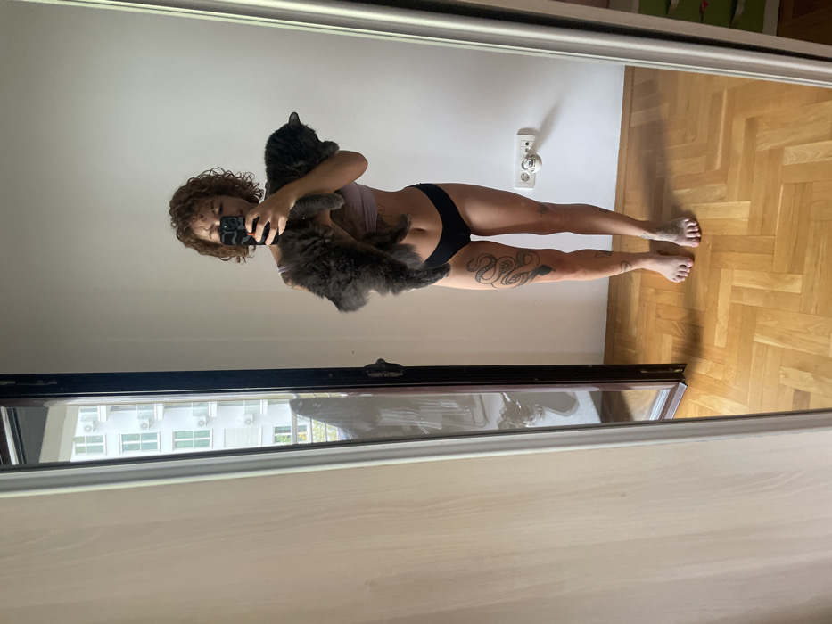 An indoor scene in Boreti, Montenegro, depicts a female individual taking a mirror selfie. The subject, standing barefoot, has short, curly reddish-brown hair and is attired in a light purple bralette and black bikini-style underwear. A prominent black ink tattoo of a coiled serpent is visible on her upper right thigh, with additional smaller tattoos on her lower legs. She holds a dark gray, long-haired cat against her torso with both arms. Her left hand, reflected as her right, holds a dark-colored smartphone, obscuring her face, as she captures the image. The room features light brown parquet flooring laid in a herringbone pattern and plain white walls. To the left of the subject, an open dark-framed door or window reveals a reflection of a multi-story white building with multiple windows and exterior air conditioning units. A white wall-mounted electrical outlet with two circular sockets is visible on the wall to the subject's right. The image is a reflection in a full-length mirror.