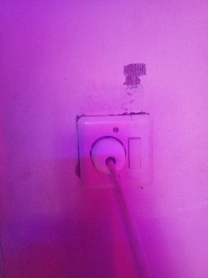A white electrical outlet is mounted on a purple-toned wall. A plug is inserted into the round receptacle of the outlet. Above the outlet, a patch of damaged wall is visible, with exposed material underneath. The wall appears aged, with uneven texture. The overall lighting has a strong purple hue.