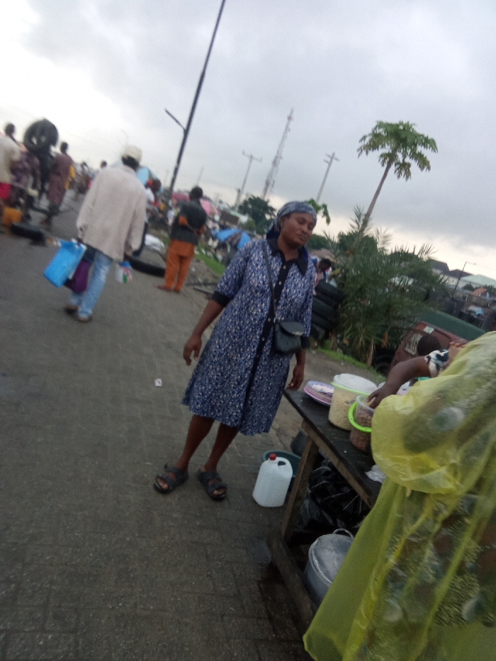 The image depicts an outdoor market scene in the city of Unknown, Unknown, under an overcast sky. In the mid-ground, a woman stands slightly left of center, facing forward. She wears a blue patterned long-sleeved dress with a dark collar, a blue headwrap, and dark sandals. A small dark crossbody bag is slung over her left shoulder. To her immediate right, a wooden market stall displays various items in plastic containers, including granular substances and nuts, alongside stacked plates. In the foreground on the right, a person in a yellow translucent raincoat is partially visible, with an arm extended towards the market stall. On the ground near the stall, a white plastic jerrycan with a red cap and a silver pot are present. In the mid-ground on the left, a man walks away from the camera, wearing a light-colored long-sleeved shirt, light blue jeans, and a light-colored cap, carrying two blue shopping bags and one purple bag in his left hand. The ground is paved, appearing somewhat damp. Several discarded black tires are stacked on the right side of the road. In the background, numerous indistinct figures are visible, indicating a busy thoroughfare or market area. Tall utility poles with overhead wires and a distant metal tower rise against the uniformly grey, cloudy sky. A slender tree with large leaves, consistent with a papaya tree, stands prominently on the right side, behind which are other green vegetation and makeshift market structures.