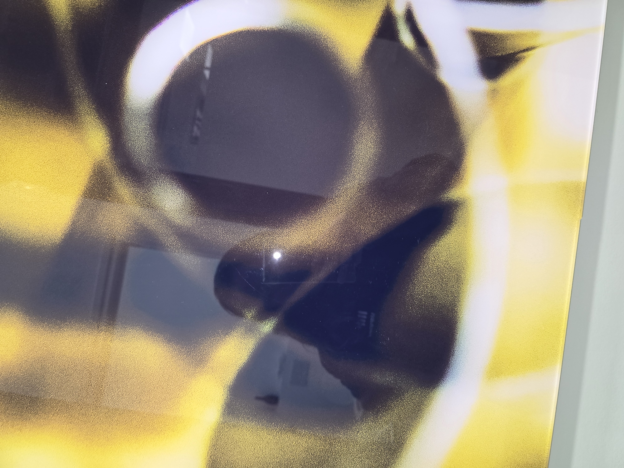 The image captures a close-up, angled view of a reflective surface, likely a framed artwork or screen, situated in Mouscron, Belgium. The surface displays an abstract composition characterized by diffused yellow and dark gray-black areas, overlaid with prominent white, curvilinear, and circular forms. A clear reflection is present on this surface, revealing the upper torso and head of an individual, presumably the photographer, holding a smartphone. The smartphone's screen or flash is visible as a distinct white light source within the reflection. The reflected background indicates an indoor environment with light-colored walls, a dark, bulbous object suspended on the left wall, and a horizontal dark line or shelf on the right wall. The lower edge of the reflective surface is visible, resting on a light grey-green support. Fine scratches are discernible on the reflective material.