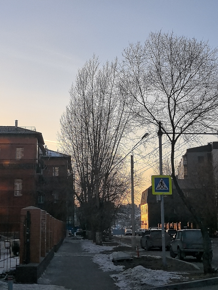 An urban street scene in Krasnoyarsk, Russia, captured during either dawn or dusk. The sky transitions from a light blue at the top to a pale orange-yellow hue near the horizon. Prominent in the midground and right foreground are several leafless deciduous trees, their bare branches silhouetted against the sky. A multi-story, dark reddish-brown building with multiple windows and a dark sloped roof featuring a chimney is visible on the left side. Partial scaffolding is present on one side of this building. In the foreground, a concrete sidewalk, partially covered with patches of snow and ice, runs parallel to a low brick fence with black metal railings. To the right of the sidewalk is a paved road, where several dark-colored vehicles, including sedans and SUVs, are parked along the curb, appearing dirty or snow-dusted. A utility pole with a streetlamp is positioned centrally on the right, supporting overhead wires. Attached to a separate pole on the right is a blue square pedestrian crossing sign (5.19.1/5.19.2) with a white pedestrian icon on a yellow background. No individuals are visible. The environment indicates cold weather conditions, likely winter or late autumn.