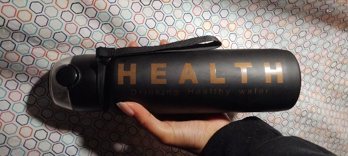 A black water bottle with a clear cap, held in a hand, displays the word "HEALTH" in gold lettering