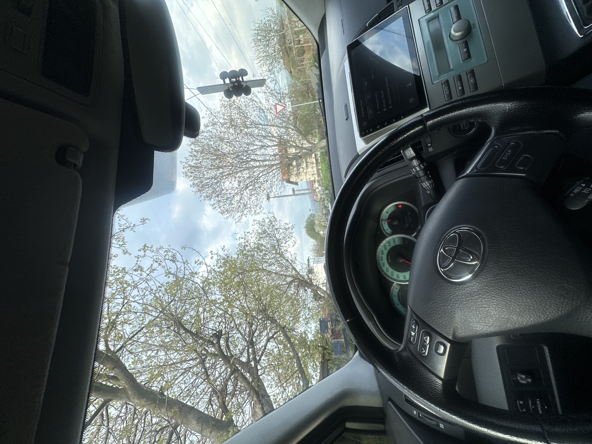 A photograph taken from the interior of a car, possibly in Porominovo, Bulgaria, focuses on the vehicle's steering wheel and dashboard. Outside the windshield, trees are visible. On the dashboard, a digital display shows "Bluetooth Music" and a track name. The speedometer reading indicates that the car is not currently in motion. Traffic signs are seen in the background.