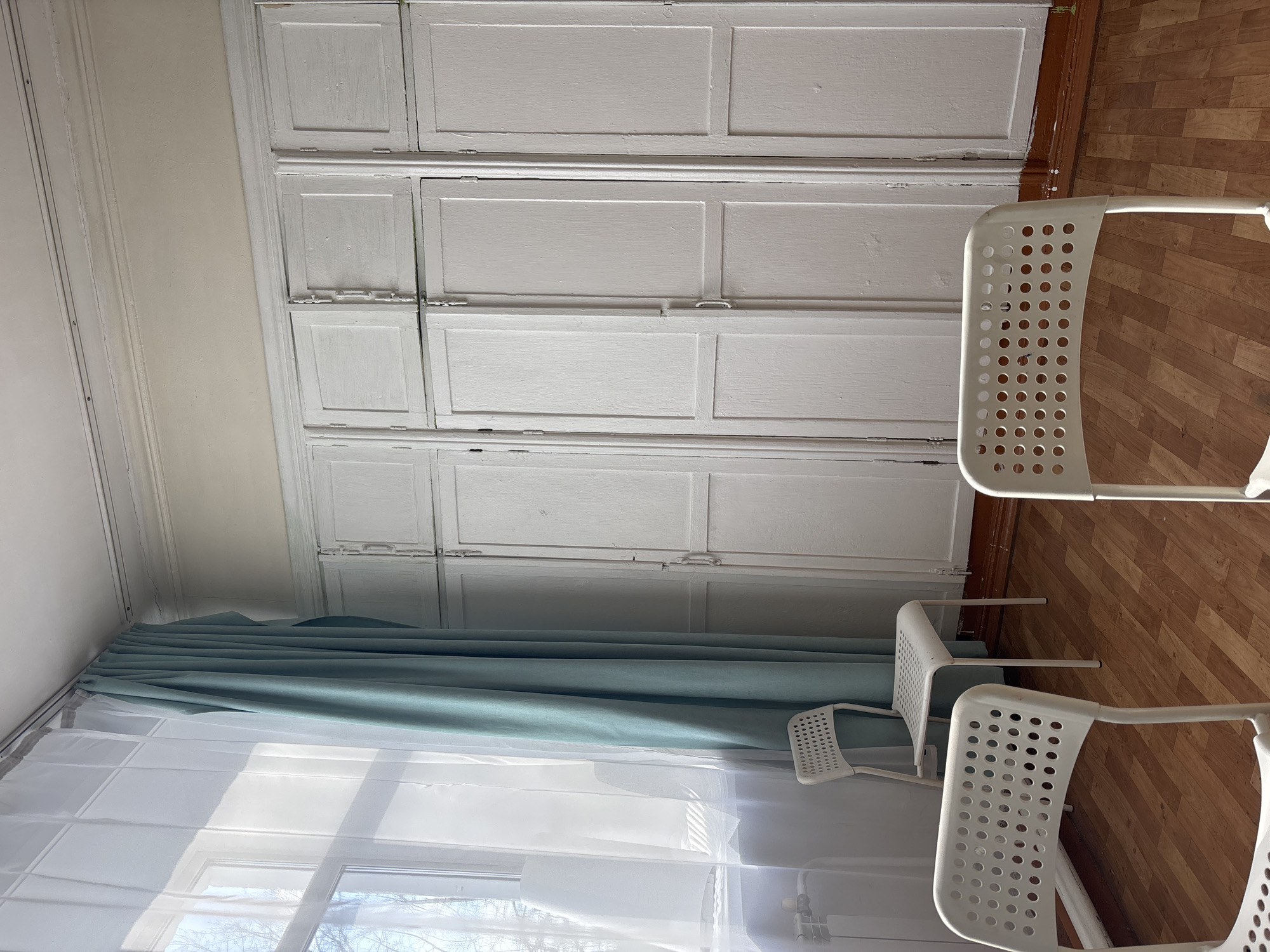 An interior view of a room in Tayshet, Russia, depicts an empty space illuminated by bright daylight from a large window on the left. The room features a light-colored, possibly beige, painted wall and a white ceiling with visible cracks and molding. A reddish-brown wooden laminate floor covers the ground. The window is fitted with a white sheer curtain and a light-teal colored curtain, both hanging from a ceiling-mounted track. Below the window, a white radiator is visible. The entire right wall is occupied by a floor-to-ceiling built-in storage unit, constructed from multiple white-painted wooden panels and doors, some with visible hinges and simple handles. Three white metal chairs with perforated backs and seats are present in the room; one is in the foreground with its back to the viewer, another is positioned closer to the window, and a third is partially visible in the far right foreground. No individuals are present, and no actions or interactions are occurring.