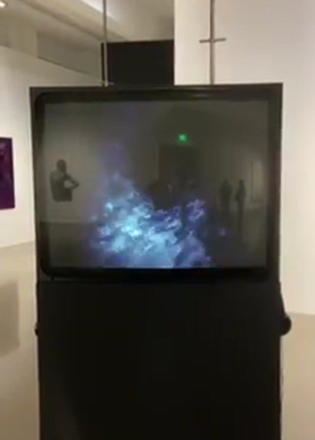 large, black television screen on a stand in an art gallery. The screen displays a moving image of blue, swirling patterns, obscuring a view of the gallery behind. In the background of the screen's image, artwork is visible on the walls and indistinct figures are standing. The gallery itself appears bright and modern, with polished floors and white walls. The television is the primary focus of the video.