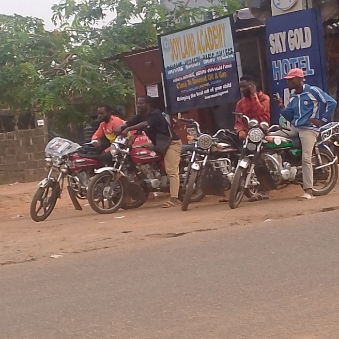 Four men are on motorcycles, parked on a dirt road. Behind them are two signs. The first sign advertises Joyland Academy, stating it offers "Claas To Descent Oil & Gas" and "Bringing the best out of your child". The second sign reads "Sky Gold Hotel". A building is visible behind the signs and a few trees are in the background. The day is overcast, casting a soft light on the scene.