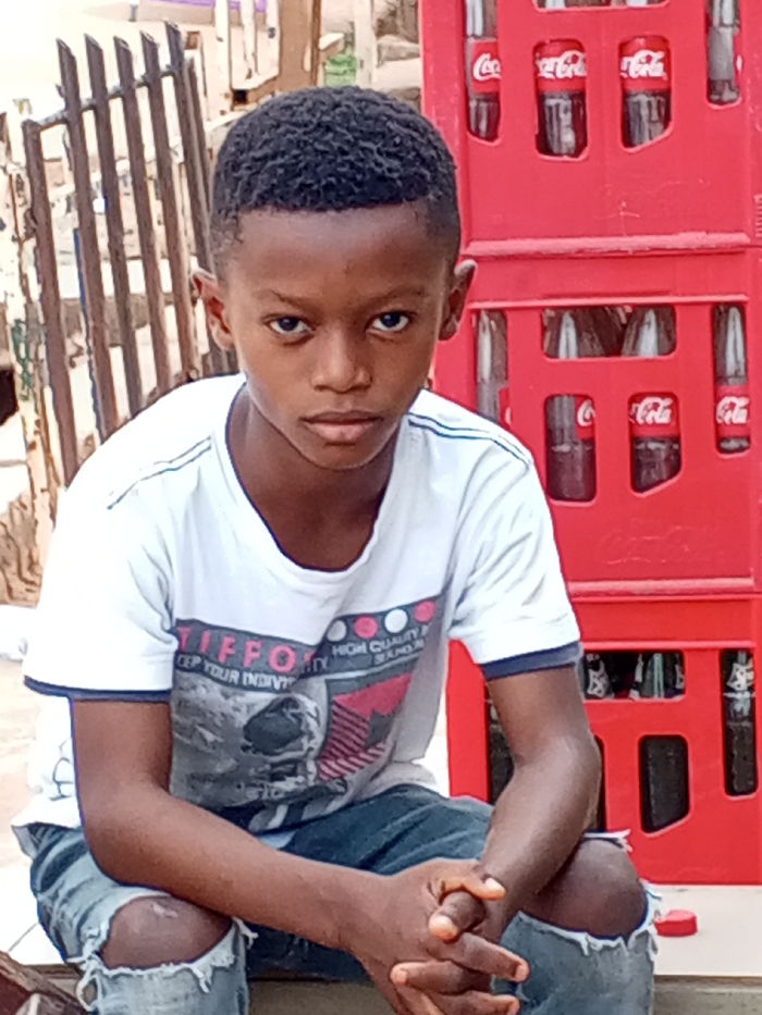A young male subject, appearing to be approximately 8-12 years old with dark skin and short, dark curly hair, is seated in a mid-shot view