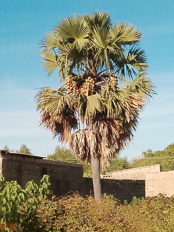 A mature palm tree stands prominently against a clear blue sky. Its crown is full of green fronds, with a cluster of brown fruits clinging to the trunk just below the fronds. Lower down, the palm's fronds are browning and drooping. Behind the tree, low brick buildings are partially obscured by bushes and vegetation, suggesting a rural or residential setting.