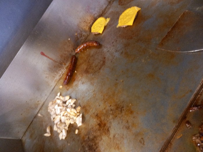 A griddle surface displays cooked sausages, chopped white meat (possibly chicken), and yellow triangle-shaped food items (perhaps tortillas)