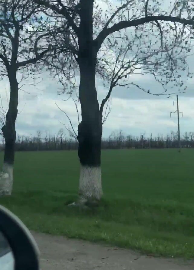 view from a moving vehicle. The scenery is a wide, green field under a sky with patchy clouds. Bare trees frame the view. A dirt road runs alongside the field. In the distance, a line of trees marks the horizon, and power lines stretch across the field.