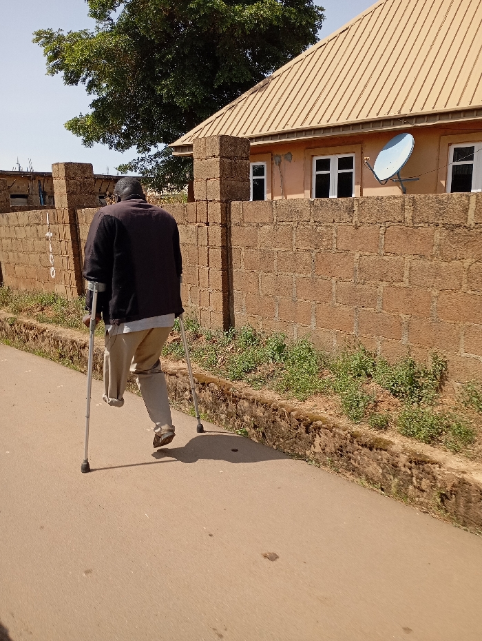 The image depicts an outdoor scene in Barakin Lerawi, Nigeria, under clear daylight conditions. The primary subject is an adult male, seen from behind, ambulating away from the viewer using two grey forearm crutches. He is wearing a dark, long-sleeved top and light-colored trousers. His right leg is absent below the knee, with the empty trouser leg folded. His left foot, wearing a dark shoe, is partially visible. He casts a shadow on the light brown paved surface, which appears to be a road or pathway. To the right of the subject is a low wall constructed from orange-brown concrete blocks, featuring several taller, dark brown concrete pillars. Beyond this wall, green vegetation is present. In the background, a building with peach-colored walls and a light brown corrugated metal roof is visible. Several white-framed windows are present on the building's facade, along with a light blue satellite dish mounted on the wall. A large tree with dense green foliage occupies the upper left portion of the frame, partially against a clear blue sky.
