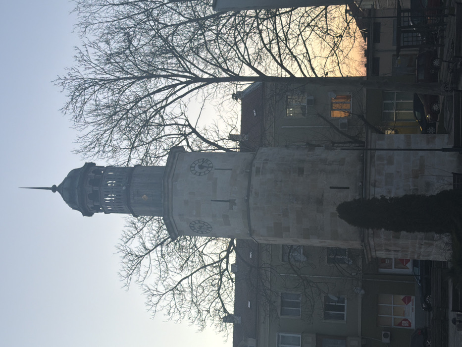 An outdoor scene captured at dusk depicts a stone clock tower as the central subject in Novi Pazar, Bulgaria