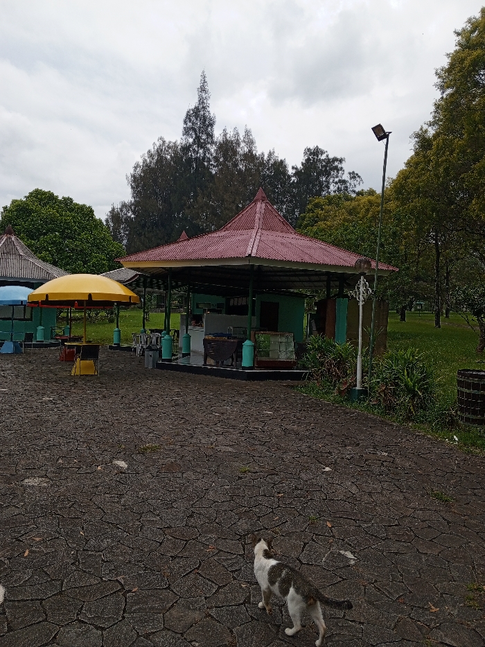 A quaint park scene unfolds on a cloudy day. Several gazebo-like structures with reddish roofs stand amidst lush greenery and tall trees. A yellow umbrella-covered table sits on a stone-paved area. A cat with gray and white fur walks across the foreground, its tail raised. A tall lamppost is visible to the right of the main gazebo. The scene exudes a peaceful, slightly overcast ambiance.