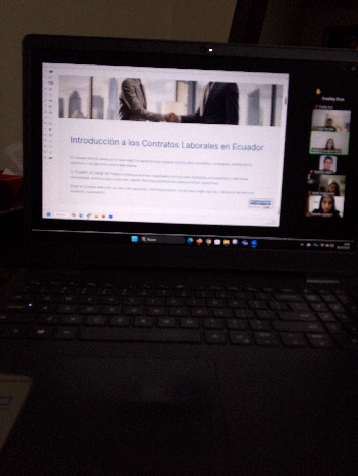 A black laptop is centrally positioned in a dimly lit indoor environment, identified as being in Machala, Ecuador. The laptop screen displays two primary elements: a presentation on the left and a video conference interface on the right. The presentation, titled "Introducción a los Contratos Laborales en Ecuador" (Introduction to Labor Contracts in Ecuador), features a banner image depicting two individuals in suits shaking hands against a blurred city skyline. Spanish text related to labor contracts is visible beneath the title. The right side of the screen shows a vertical column of active video feeds from a virtual meeting, with multiple participants visible, including one identified as "Freddy Sisa" at the top. The laptop's keyboard is partially visible in the foreground, mostly obscured by shadow. The surrounding room is indistinct due to low light, with no other objects or individuals clearly discernible.