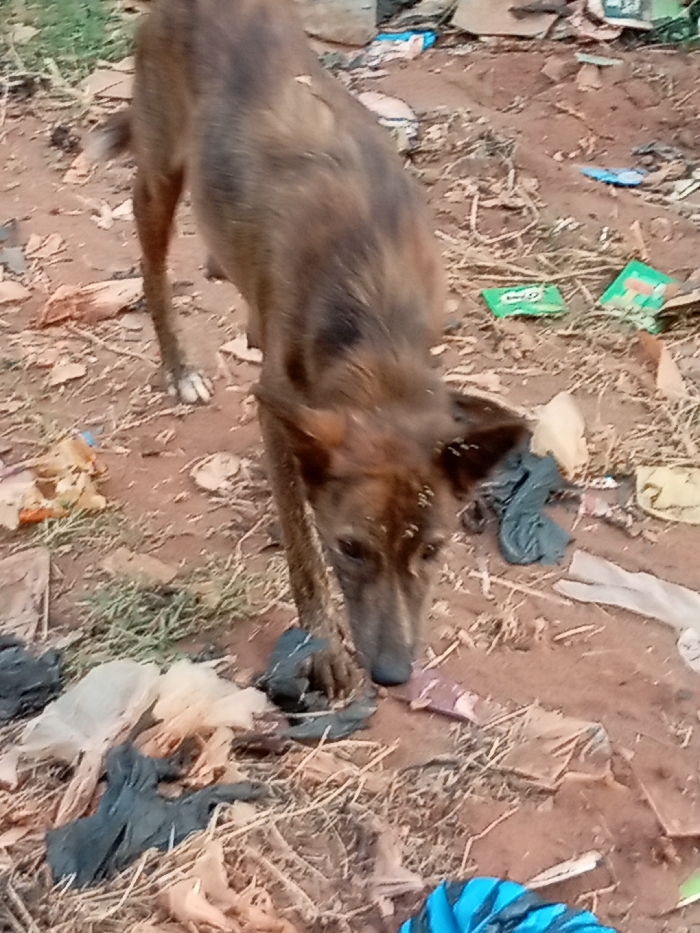 - "A thin, brindle-colored dog stands among scattered trash and debris" by FM-m0BBE2, licensed under CC BY 4.0