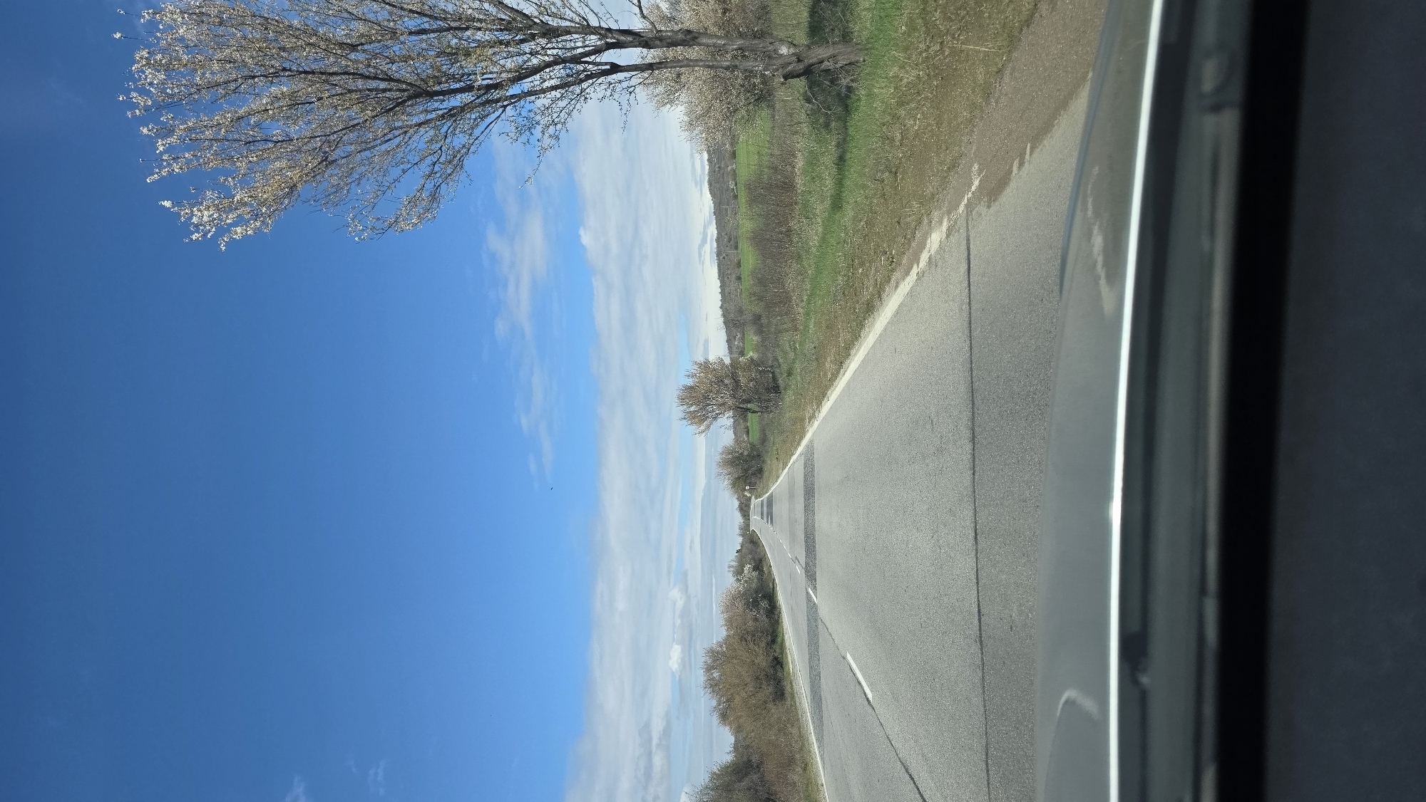 A roadside view in Mursalevo, Bulgaria. A gray asphalt road stretches into the distance, with a white dividing line. Adjacent to the road is green vegetation, and trees line the horizon. The sky is blue with scattered clouds. The image is taken from inside a vehicle, with the car door visible on the right side.