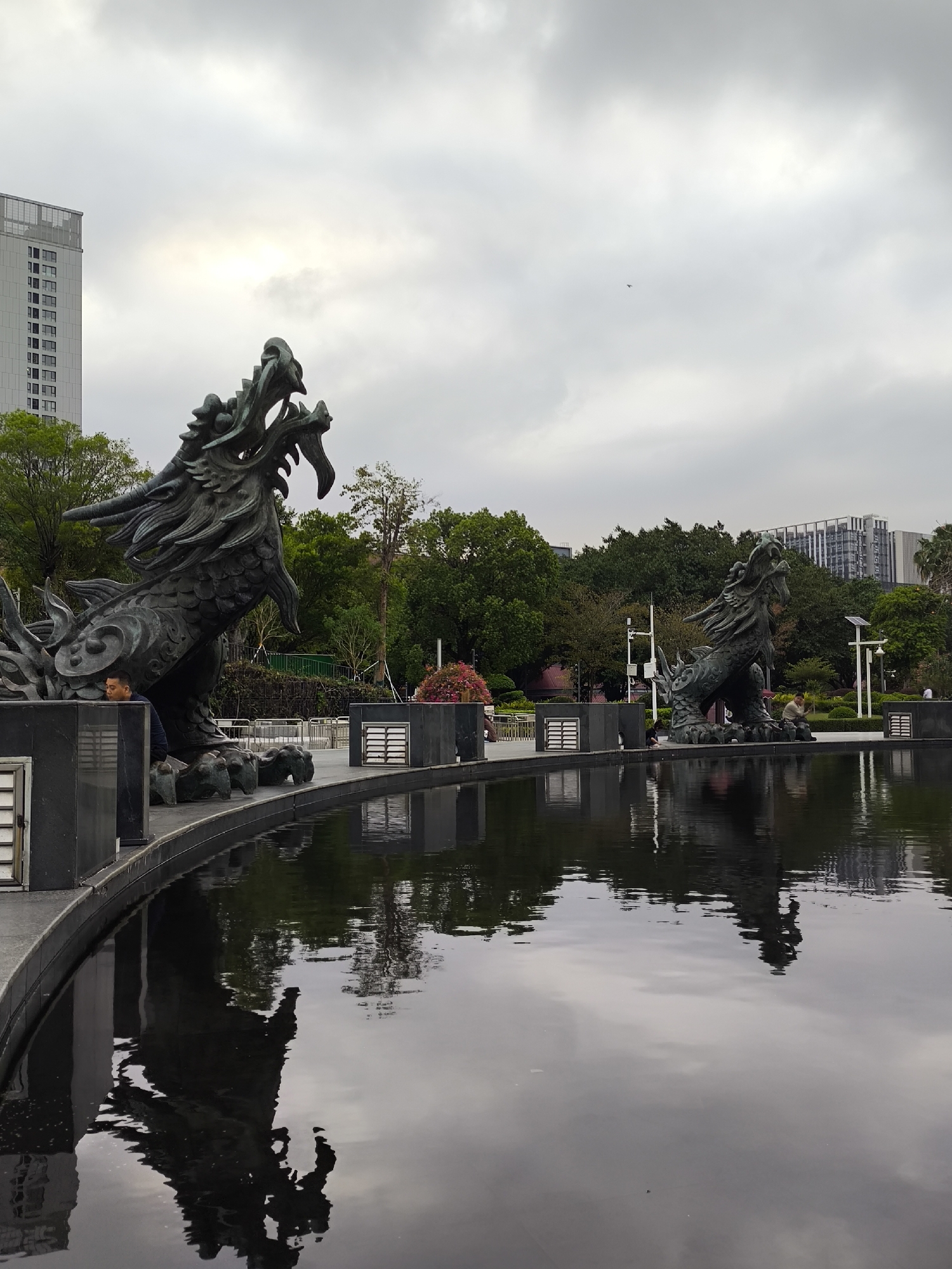This photo captures a scene in Longgang District, China, featuring two dragon statues overlooking a pool of water. The statues are dark in color and appear to be made of a metallic material, with intricate details showing their dragon features. Their reflections are visible in the water, which is dark and slightly rippled, indicating a subtle breeze. The first dragon statue is slightly to the left of the frame, while the second is positioned further in the background on the right. Behind the statues, there's a backdrop of trees and buildings, suggesting the location is a park or a public space within an urban environment. A high-rise building can be seen in the upper left portion of the image, and other structures are visible in the distance to the right. Near the first dragon, a person is partially visible, leaning or crouching behind the statue's base. Near the second dragon, a person is sitting on the stone, while other people can be seen further off near the trees. The sky is overcast, which casts a soft, diffused light over the entire scene.