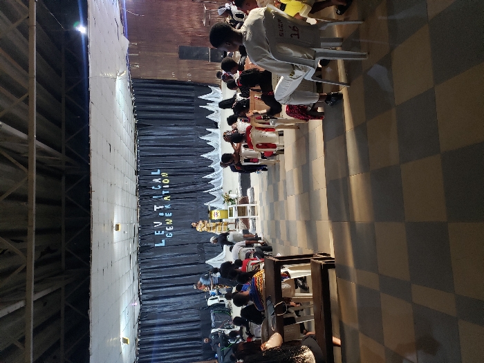 This image depicts an indoor gathering in Uturu, Nigeria. The scene is set within a large hall featuring a checkered tiled floor and an exposed truss ceiling with partial white paneling. At the front of the hall, an elevated stage is draped with black curtains, displaying the text "LEVITICAL GENERATION" in blue and white letters. A speaker, dressed in a patterned outfit, stands behind a light-colored podium on stage, addressing an audience. Another individual stands near the speaker. To the left of the stage, a person plays a guitar, and another is positioned near a keyboard setup. Large dark speakers are visible on either side of the stage. The audience, primarily young adults, occupies rows of mixed white plastic chairs and wooden benches, all facing the stage. One individual in the foreground is seated on a white plastic chair, wearing a white long-sleeved shirt with "SUCA 16" marked on the back. The space is illuminated by artificial lighting.