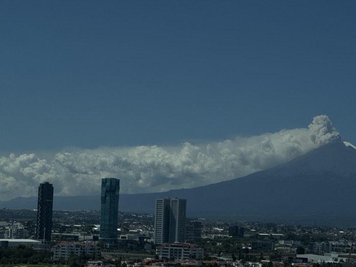 - "The image presents a panoramic, high-vantage view of the Angelópolis district within Heroica Puebla de Zaragoza, Mexico, featuring the Popocatépetl volcano in the background" by FM-tglDt1, licensed under CC BY 4.0