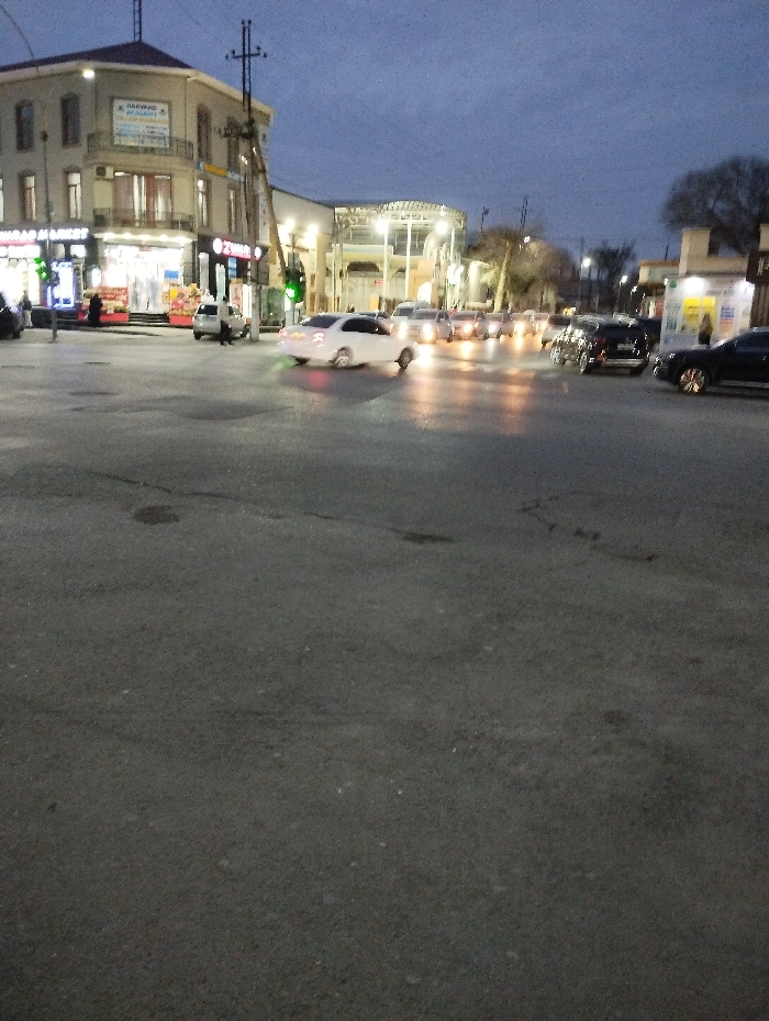 The image displays an urban street intersection in Kokand City, Uzbekistan, specifically at Xonobod 2-tor ko'chasi 57, identifiable by the "HARVAND MARKAZI" and "ZIMBO" signs on the prominent corner building. The scene is captured at dusk or early night, characterized by low ambient light and significant artificial illumination from streetlights and building facades. The foreground consists of a dark asphalt roadway, appearing dry. In the midground, a white sedan, possibly a Chevrolet Onix, is centrally positioned, in motion from right to left across the frame, with its taillights illuminated. To its right, a queue of at least six additional vehicles, predominantly sedans, are visible with their headlights active, suggesting traffic flow or a temporary stop. On the far right, a dark SUV is partially visible, facing right. Near the left sidewalk, a white van or smaller SUV is stationary, and a dark vehicle is partially visible on the extreme left. On the left side of the intersection, a multi-story, light-colored building with a corner facade is prominent. Its ground floor houses brightly lit businesses, including "SARANJ MARKET" and a store identified by "ZIMBO." A banner for "HARVAND MARKAZI" is affixed to an upper floor. A dark, metallic utility pole with crossarms is situated directly in front of this building, alongside a green-lit traffic signal. Two individuals are discernible on the sidewalk near the "SARANJ MARKET" entrance. In the background, a large, modern structure with a metallic roof and glass elements is visible. Further to the right, bare trees and a smaller, brightly lit building are present. The sky above is a dark blue-grey.