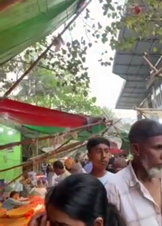 A person in a mask is seen at an outdoor market. There are many people around, moving through the market area. A woman in a pink headscarf buys vegetables. A stall is shown with multiple people sorting through a large pile of red onions. The stall has a scale and is under a concrete structure.
