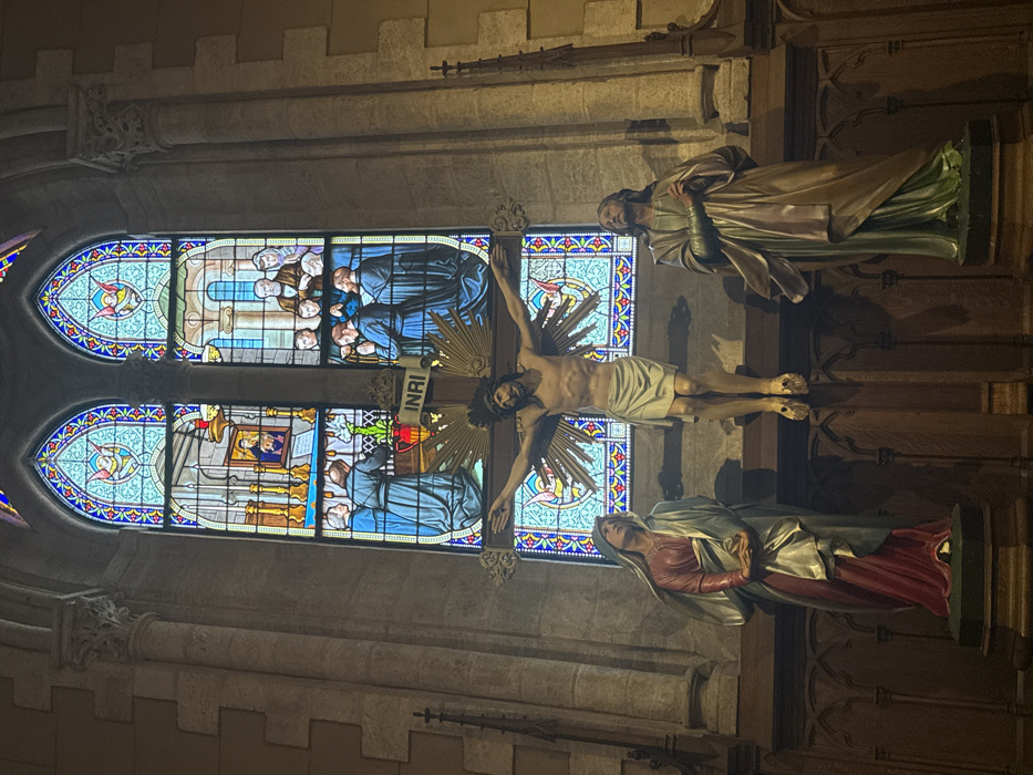 depiction of the crucifixion inside a church. Jesus Christ is mounted on a cross with the inscription "INRI" visible. Flanking the cross are statues of religious figures, one dressed in green and gold robes, the other in red and grey robes. Behind the cross and statues is a stained-glass window featuring scenes of religious figures. The scene is illuminated by soft, diffused lighting.