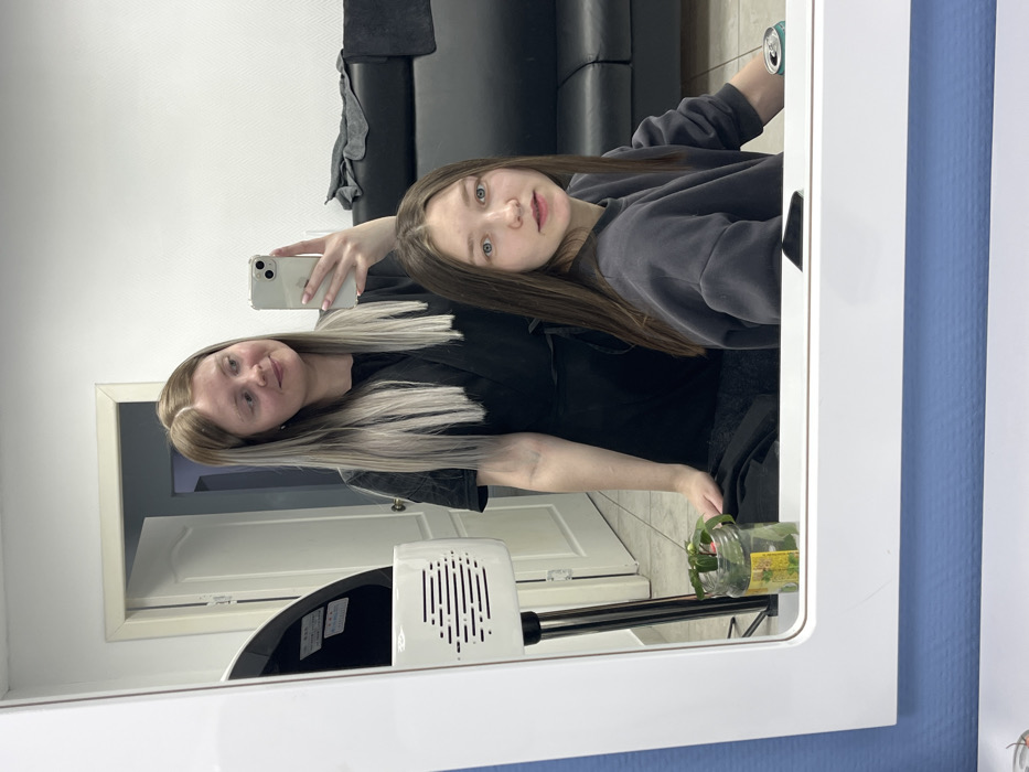 A mirror selfie captures two females in what appears to be a hair salon in Chaikovsky, Russia