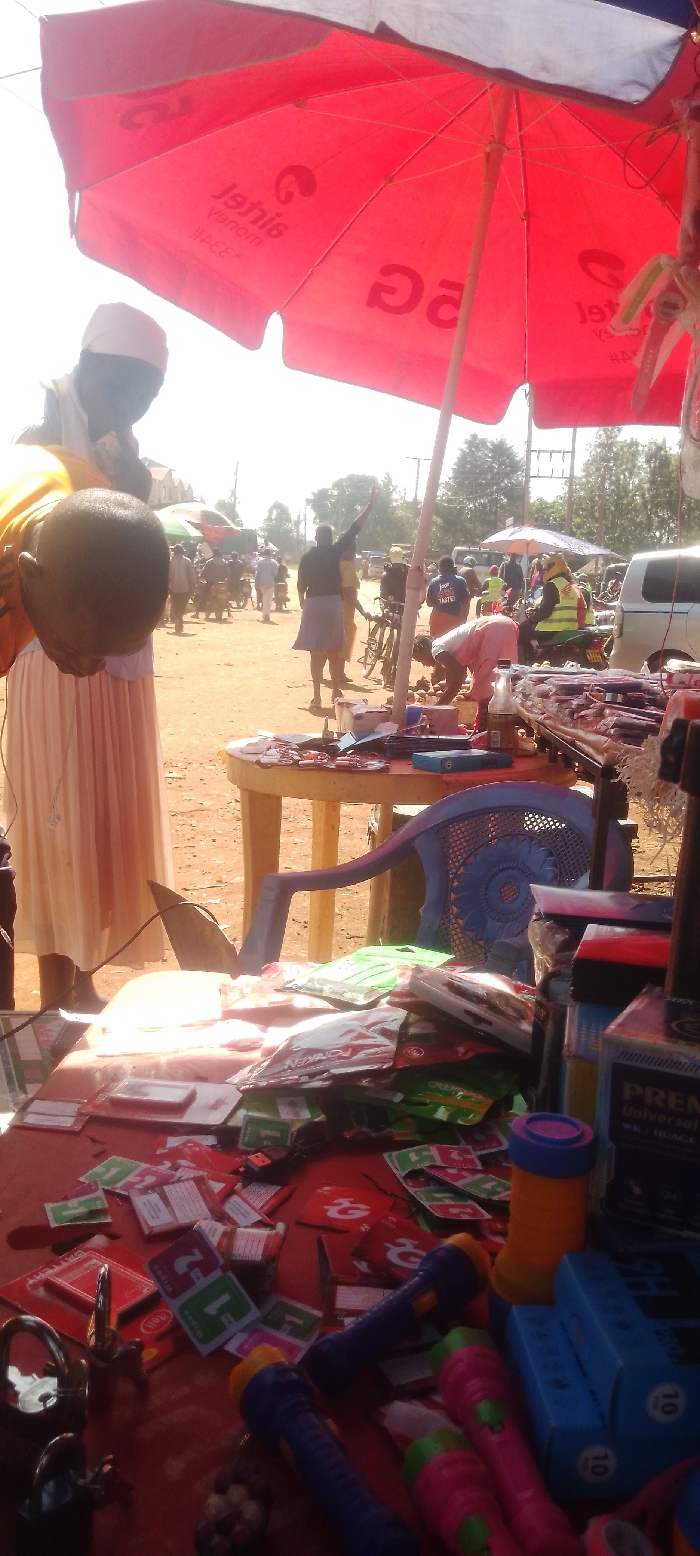 This image depicts an outdoor market scene in Chemuche ward, Kenya, under a bright, sunny sky