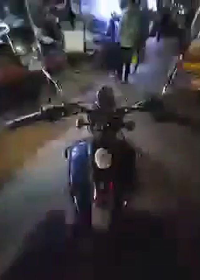 A video shot from the perspective of someone sitting on a blue motorcycle in an outdoor marketplace at night