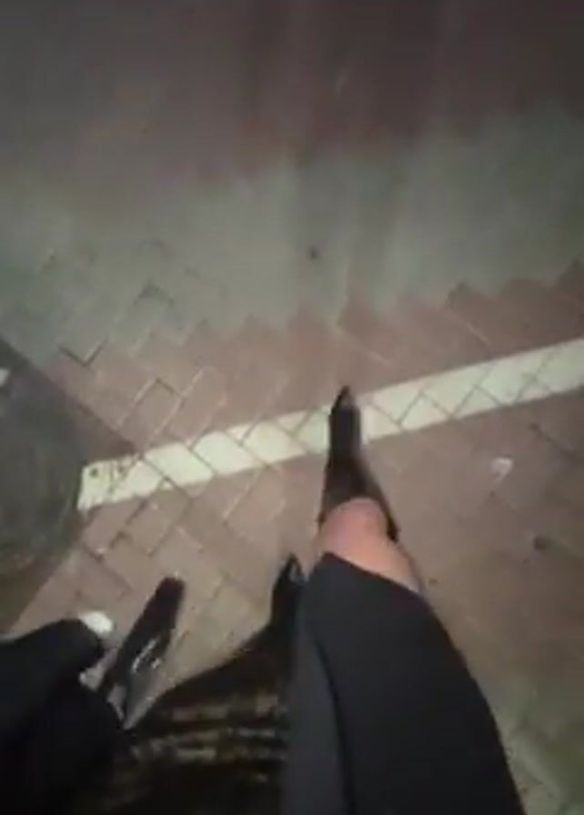 A young woman in a black blazer, black top, brown patterned skirt and black knee-high boots walks on a brick sidewalk at night, filming herself in selfie style with her phone. She is fair-skinned with blonde hair pulled back in a partial ponytail. She wears multiple gold necklaces. A storm drain is visible to the left.