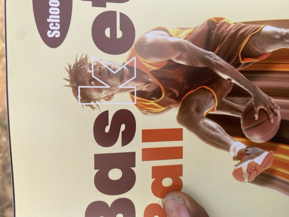 A tan-colored image features a dynamic basketball player dribbling a ball. The player wears an orange and brown uniform. The text "School B" is visible, with the "K" uniquely displayed as an outline shape over the player's head. The words "asketball" are vertically oriented in brown and orange. A fingertip obscures part of the "a" in "Basketball" near the bottom of the image.