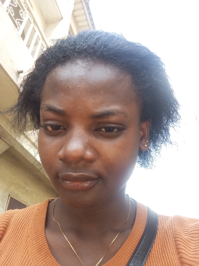 A close-up portrait shows a young adult female with dark skin and dark, curly hair, positioned in Agburu Uke, Nigeria