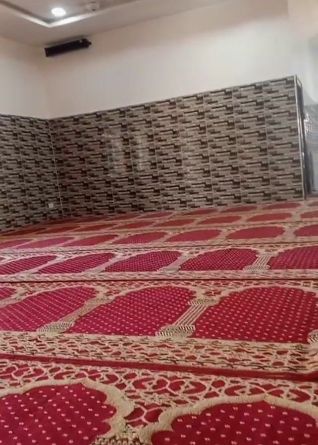 interior of what appears to be a mosque. A large red carpet with gold patterns covers most of the floor. The carpet is designed with repeating shapes indicating where worshippers should stand for prayer. The walls are white except for a section covered in gray and black brick-like tiles. The ceiling is white with recessed lighting. A ceiling fan is also visible. The video appears to be taken from a low angle near the floor. There are no people visible in the video.