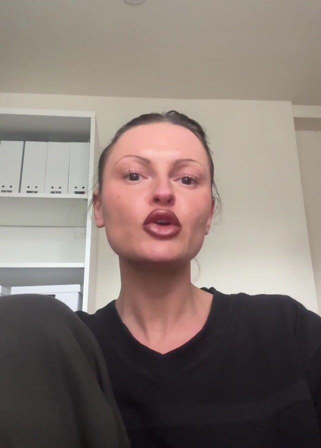 A woman in a black V-neck t-shirt is in a video from a low, head-on perspective. She has dark hair pulled back in a bun and full lips with dark lipstick. Behind her, to the left, is a white shelf unit with three rows of white binders. She makes a silly face and types on a computer keyboard. The background is a plain off-white wall with a recessed light fixture in the center of the ceiling.