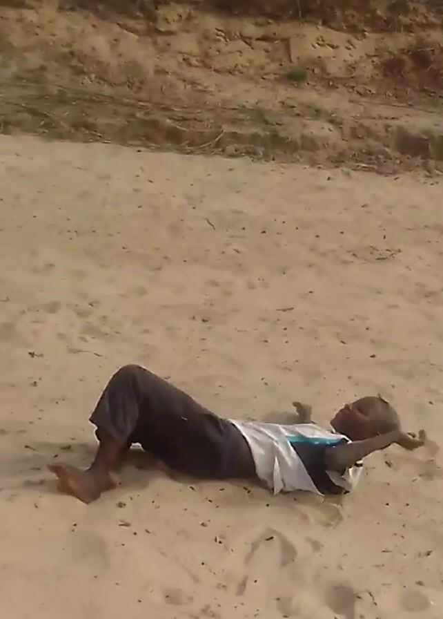 A young barefoot person is seen rolling and falling on a sand beach. The person is wearing dark pants and a light-colored shirt with dark stripes on the sleeves. The person gets up and runs on the beach. Behind the beach, there is a hillside with scrubby vegetation.