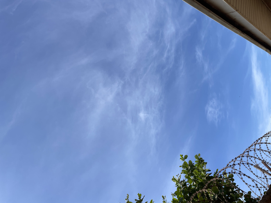This image depicts an outdoor daytime scene in Sabon Tasha, Nigeria. The majority of the frame is filled with a clear, bright blue sky containing scattered, wispy white clouds. In the lower left quadrant, the vibrant green foliage of a tree is visible, partially obscuring a coil of rusty barbed wire (razor wire) that appears to be part of a perimeter security installation. On the lower right side, the light-colored eave and soffit of a building's roof structure are present. No individuals, specific actions, or interactions are visible in the scene.